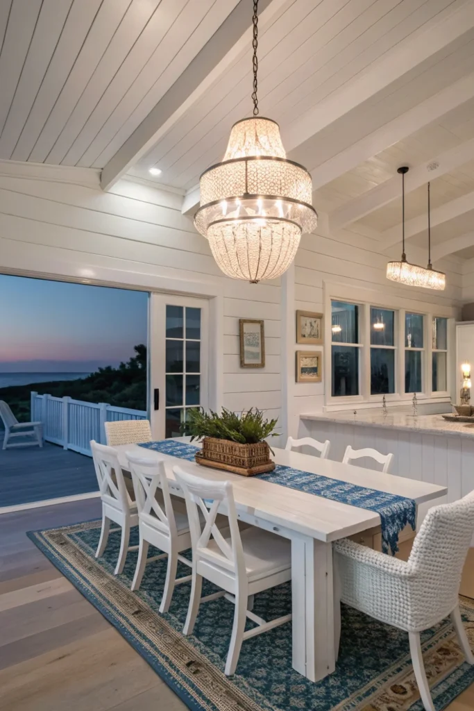 Install rope-wrapped chandeliers, capiz shell pendants, clear glass fixtures, and weathered metal lanterns that bring coastal character to your beach house decor lighting scheme. These statement pieces provide necessary illumination while reinforcing your seaside aesthetic.