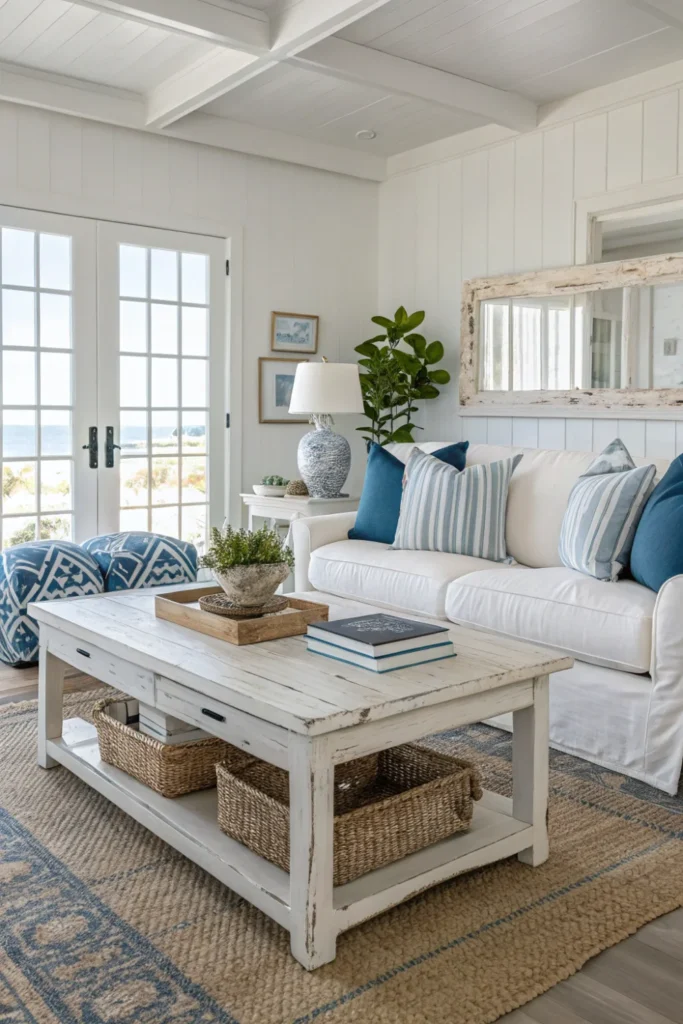 Choose furniture with visible wood grain showing through painted finishes for authentic coastal charm. Mix weathered whites with natural woods to create depth and prevent the monochromatic look from feeling flat.