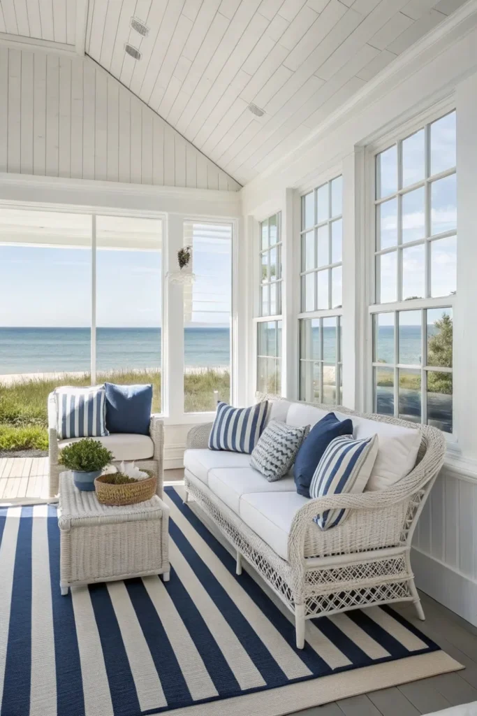 Add timeless coastal charm with navy and white striped fabrics on pillows, rugs, curtains, and upholstery throughout your beach house decor scheme. These classic patterns bring structure and visual interest while maintaining the relaxed, casual vibe essential to seaside living.