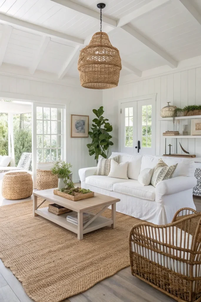 Layer jute rugs, seagrass baskets, rattan furniture, and woven pendant lights that introduce warm natural textures to your beach house decor. These organic materials add warmth and dimension while maintaining the casual, coastal aesthetic.