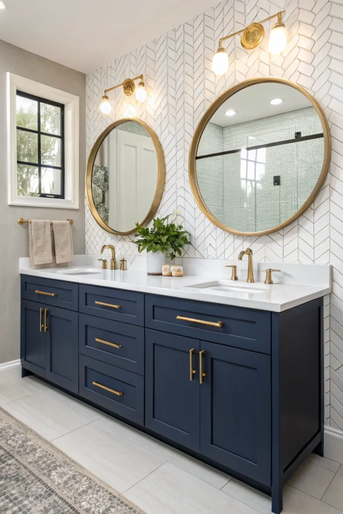 A navy blue vanity cabinet paired with brushed brass or antique gold hardware is one of the most impactful and widely loved blue washroom ideas — the deep, saturated blue creates a dramatic anchor for the room while the warm metallic handles add richness and contrast.