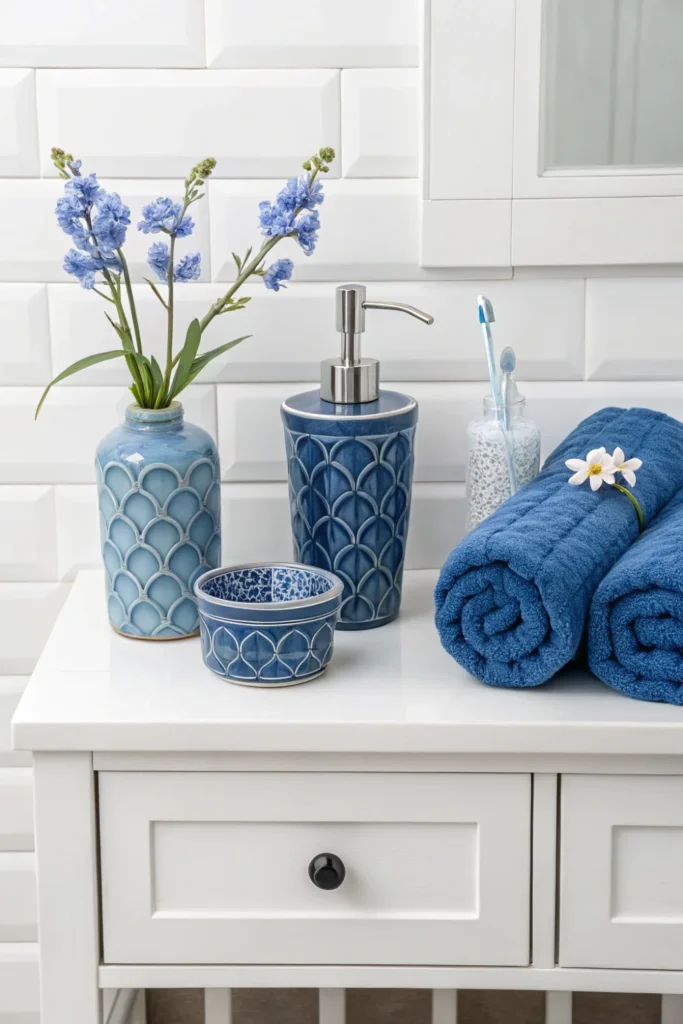 Limit your cobalt blue accent items to four or five coordinated pieces — a towel set, a soap dispenser, a toothbrush holder, and a single vase or candle. More than this tips from curated into cluttered.