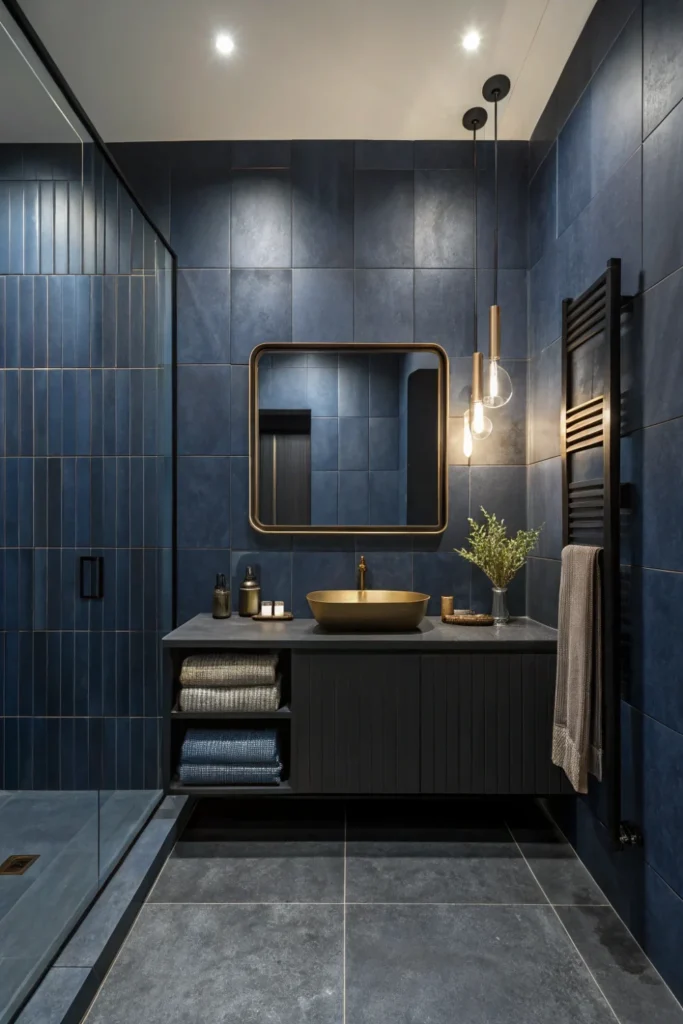 Blue is one of the most style-flexible of all bathroom colours — deep navy works in both ultra-modern and traditional interiors, depending entirely on the fixtures, hardware, and tile choices that accompany it. Navy with matte black fixtures reads contemporary; navy with brass cross-handle taps and a roll-top bath reads classically traditional.