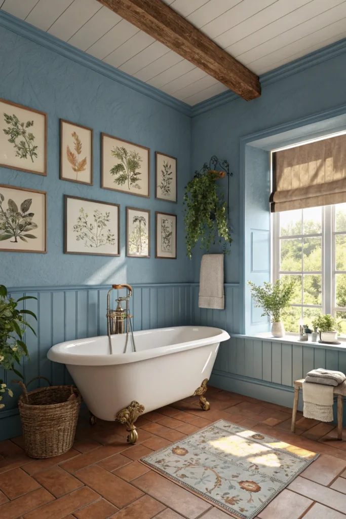 A French blue or cornflower blue washroom with vintage-inspired fixtures — a roll-top bath, cross-handle taps, a pedestal sink, and framed botanical prints — creates an utterly charming, timeless aesthetic rooted in European country house design.