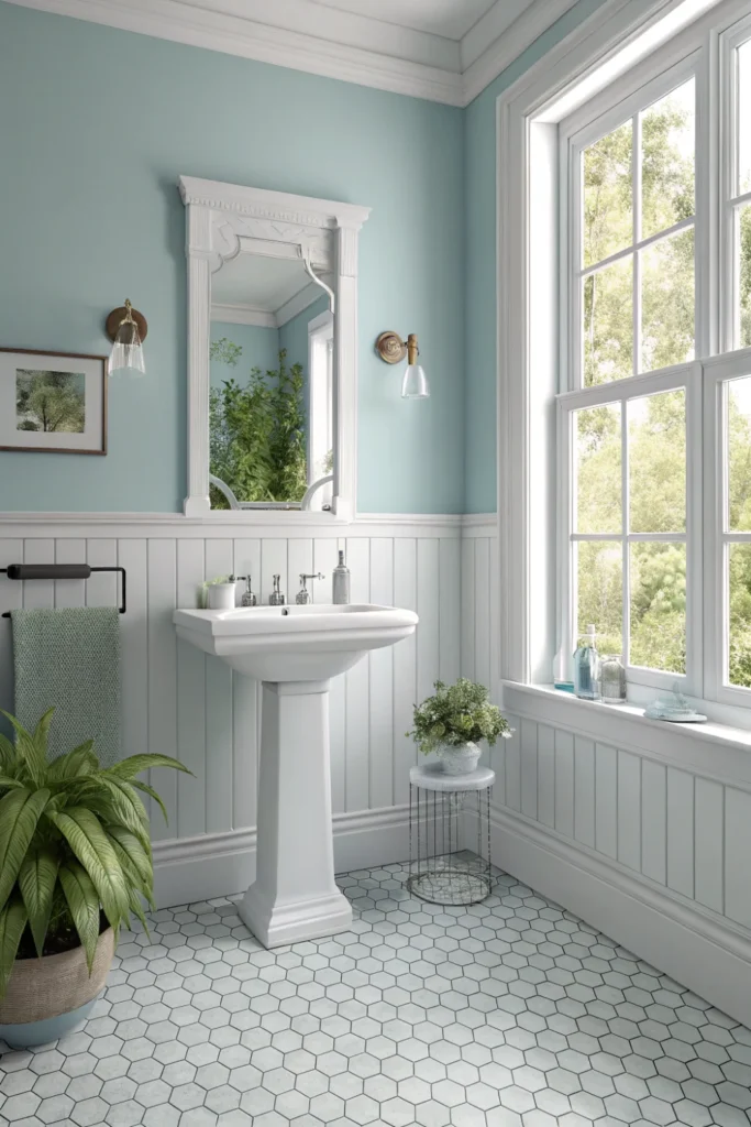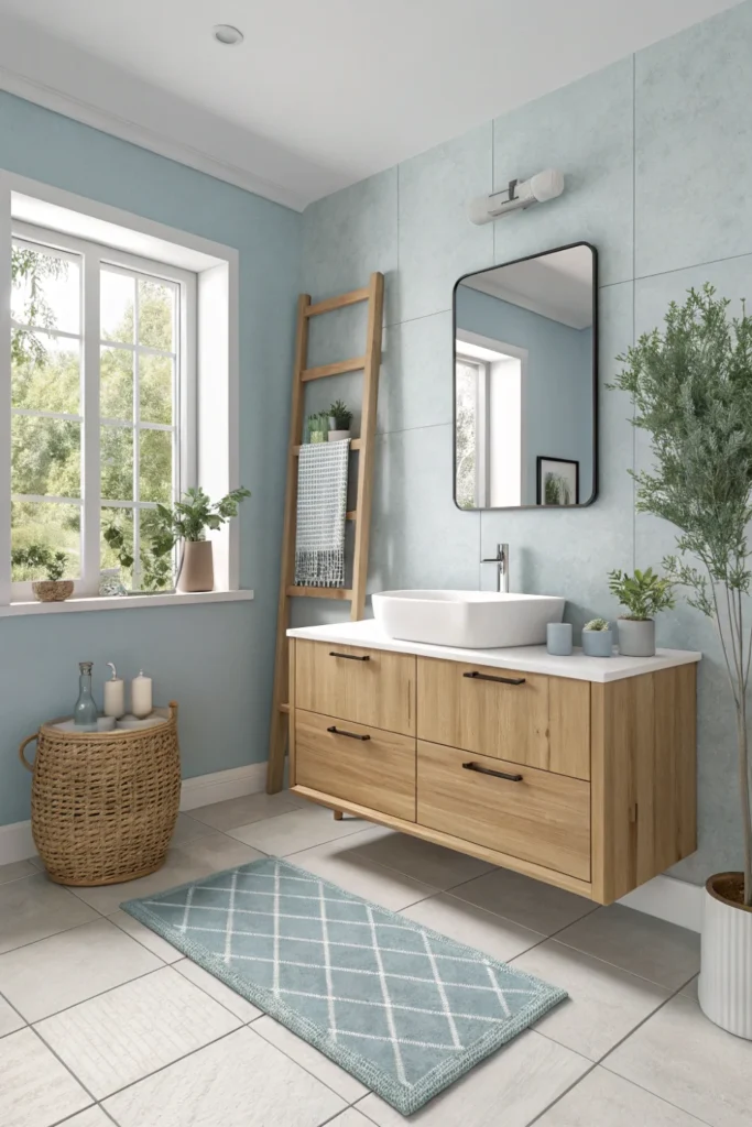 Painting washroom walls in a soft powder blue or sky blue is the most accessible and budget-friendly of all blue washroom ideas — a single tin of paint can completely transform the room’s mood in an afternoon.