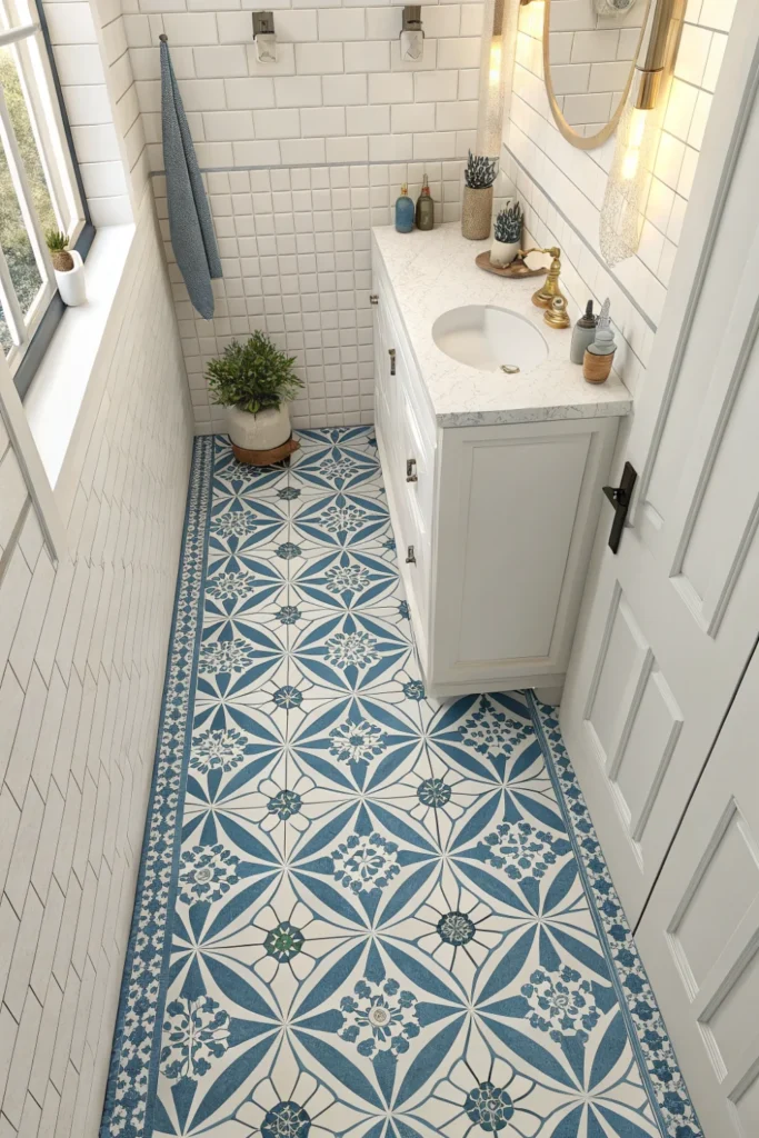A blue and white Moroccan encaustic tile floor is one of the most character-rich blue washroom ideas — the intricate geometric pattern adds artisan personality, visual warmth, and a sense of history that plain tile and painted walls simply cannot deliver.