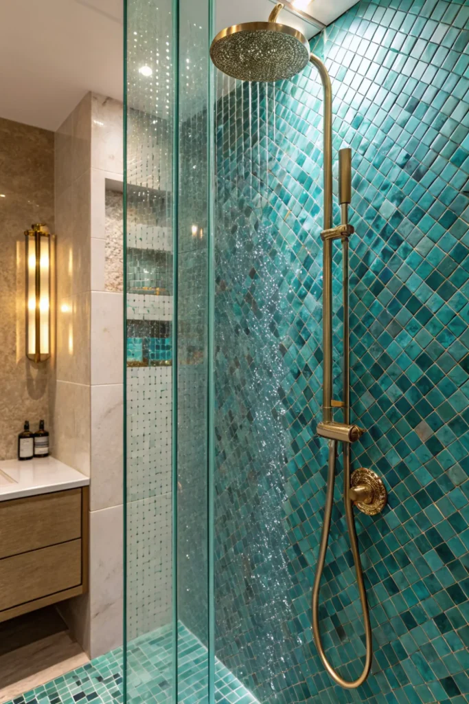 Teal mosaic tiles pair beautifully with natural stone floors, warm timber vanities, and brass or copper fixtures, creating a rich, jewel-box aesthetic. The shower becomes the undeniable focal point of the entire bathroom.