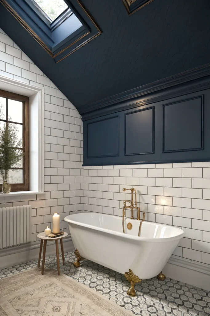 That said, deep navy used strategically — on a single feature wall, the ceiling only, or as a vanity cabinet colour — can work beautifully in small bathrooms too. The key is ensuring at least three of the room’s surfaces remain light to balance the dark accent.