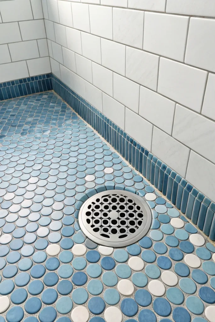 Choose an ombré penny tile sheet that transitions from pale blue at the edges to deeper blue at the drain — the gradient draws the eye toward the centre and makes the shower floor feel intentionally designed rather than simply coloured.