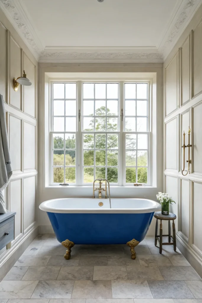 Mix at least two different blue tones in a French-inspired blue washroom — a slightly deeper blue on one wall or the bath panel against a lighter blue elsewhere adds the tonal depth that makes the look feel genuinely layered rather than flat.
