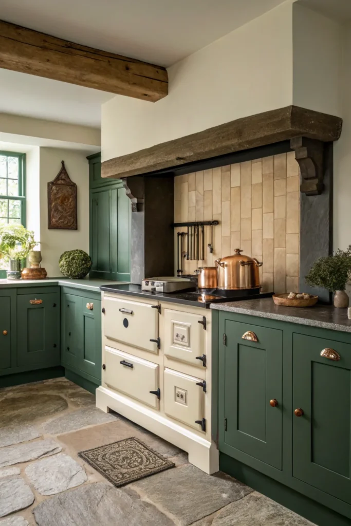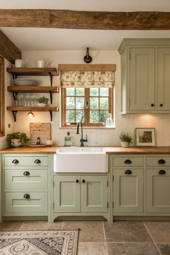 The most authentically cottage kitchen cabinet and wall colours are those drawn from the traditional British paint heritage — sage green, duck egg blue, warm cream, off-white, dusty rose, and deep forest green are the colours most consistently associated with the aesthetic and most reliably beautiful in a country kitchen context. These are colours with grey or earthy undertones rather than the clean primaries of a contemporary kitchen, and that subtle complexity is what makes them feel genuinely period-appropriate rather than fashion-forward.