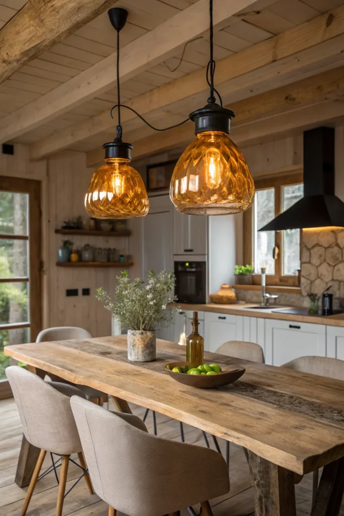 Hang cottage kitchen pendants slightly lower than you instinctively think is right — a pendant that seems “too low” at 65–70cm above the table surface creates the intimate, pool-of-light warmth that defines good cottage kitchen evening atmosphere, while a pendant hung high enough to not obscure sightlines provides neither good task light nor the warm ambience the aesthetic requires.