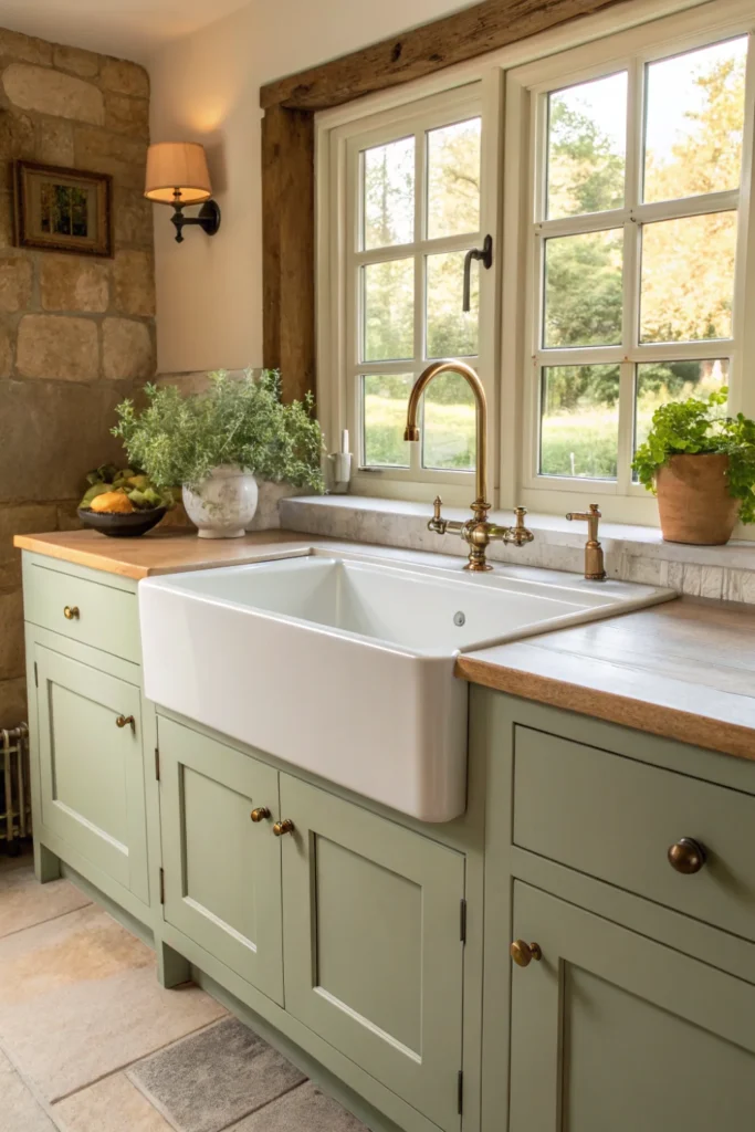 A deep Belfast or butler sink — a large, heavy-duty ceramic basin with an apron front, originally designed for the working kitchens of Victorian houses — is one of the most characteristically cottage kitchen fixtures available, instantly communicating the unpretentious hardworking warmth that defines the aesthetic.