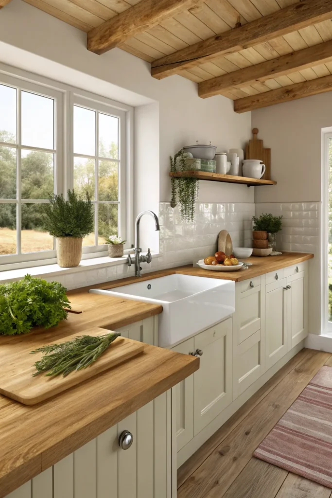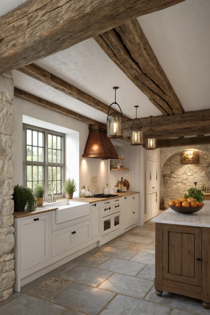 Exposed wooden ceiling beams are the architectural signature of a genuinely charming cottage kitchen — they add structural character from above, frame the room with warm organic material, and contribute the sense of age and permanence that no paint colour, tile, or furniture arrangement can replicate when the ceiling above is flat and modern.