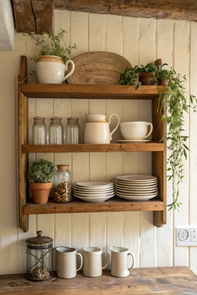 Open wooden shelves displaying a mix of vintage and everyday crockery — stacked white plates, mismatched mugs, glass storage jars of dry goods, and a few well-chosen decorative pieces — are one of the most visually characteristic cottage kitchen elements, communicating the lived-in, collected-over-time quality that flat-fronted cabinets with concealed contents can never provide.