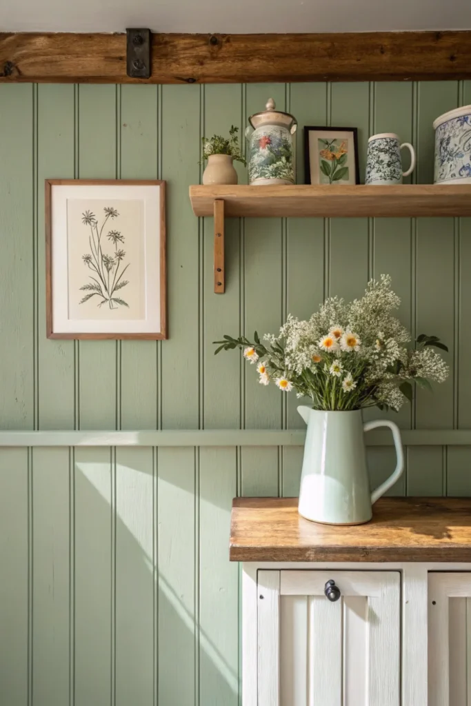 Tongue-and-groove or shiplap wall panelling below dado height is one of the most characteristic and practically effective cottage kitchen wall treatments — it adds the texture, rhythm, and period character of traditional joinery to the lower walls while providing a surface that is far more resistant to kitchen splashes, bumps, and chair-back marks than painted plaster alone.