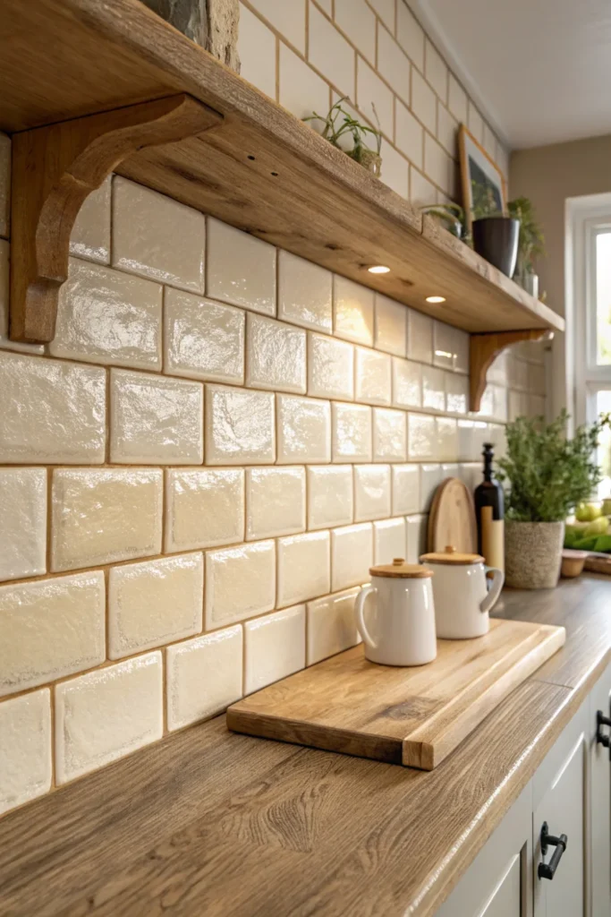 Handmade ceramic tiles — in a warm white, cream, or gently coloured glaze with the characteristic slight surface variation of hand-firing — are the perfect cottage kitchen splashback material, adding the artisanal quality, subtle imperfection, and visual warmth that machine-made tiles, however well-crafted, cannot replicate.