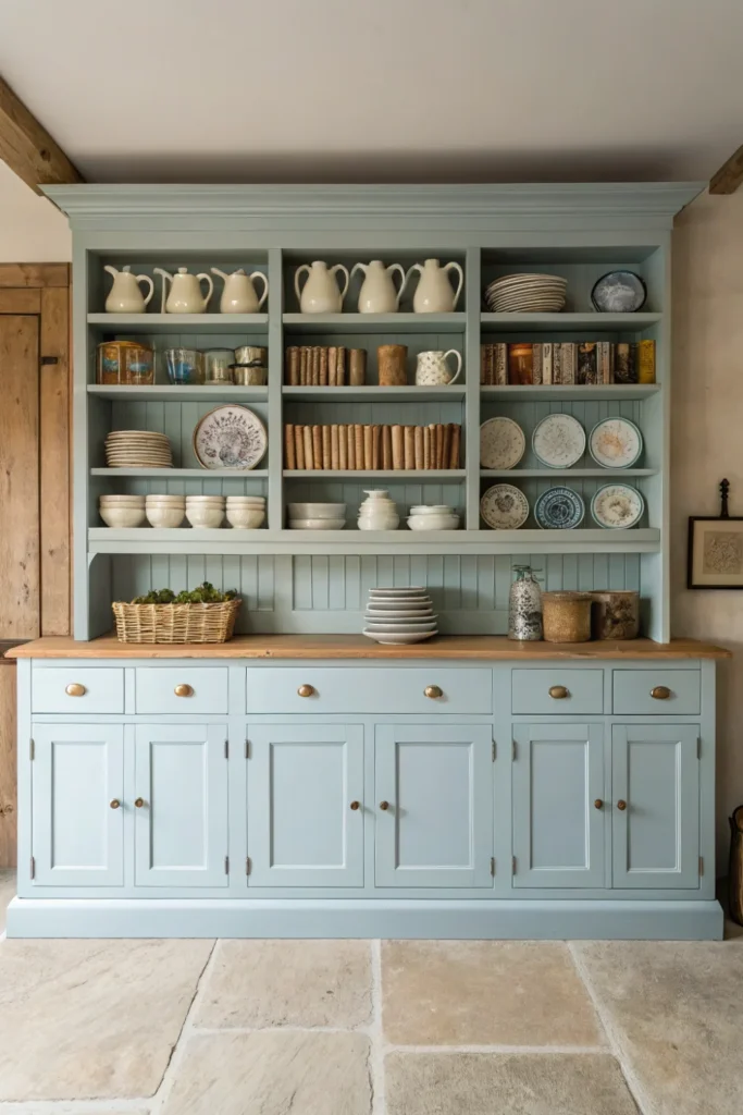 A freestanding kitchen dresser or Welsh dresser — a large unit combining open display shelving above with closed cabinet storage below — is one of the most beloved and distinctive cottage kitchen furniture pieces, providing a generous wall-anchoring storage display that simultaneously organises the kitchen and transforms it into a room that tells a visual story through its collected objects.