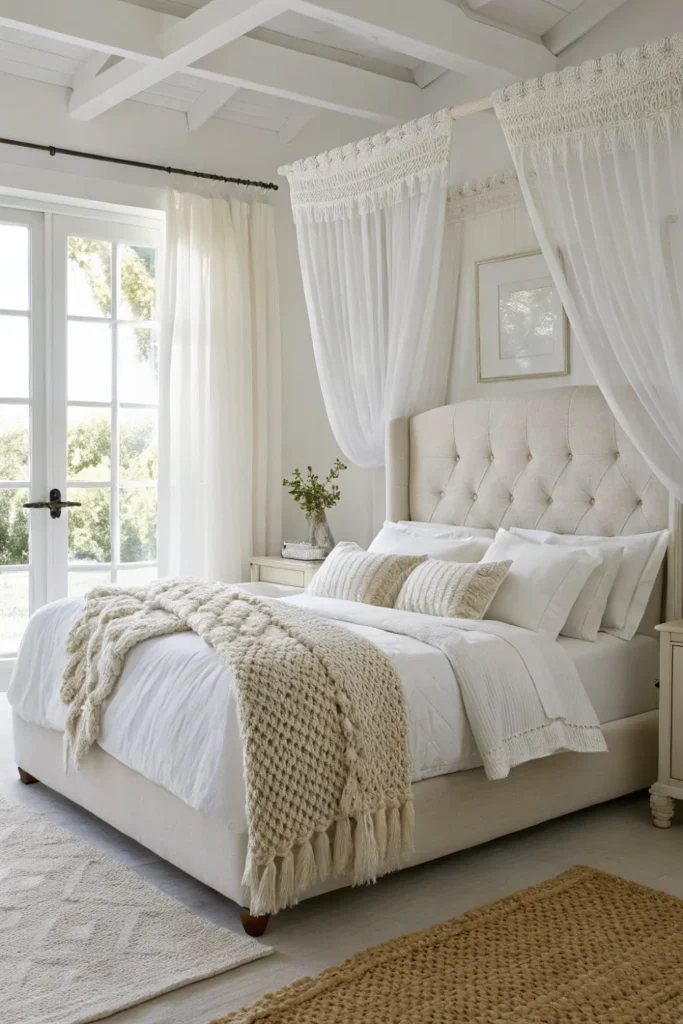 Add texture variety rather than colour variety in an all-white and cream bedroom — a waffle-weave blanket, a chunky knit throw, a linen duvet cover with slight natural texture, and a smooth cotton fitted sheet create a visually rich layering of whites that feels considered and luxurious rather than monochromatic and flat.