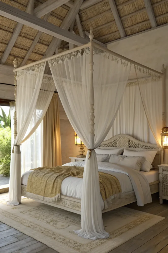 Drape sheer white or cream linen fabric loosely from the canopy frame rather than installing structured curtains — casual swags of sheer linen create an effortlessly romantic quality that tailored drapes cannot match, and the movement of fabric in air circulation adds a living, organic quality to the bed that makes it feel genuinely different to sleep beneath.