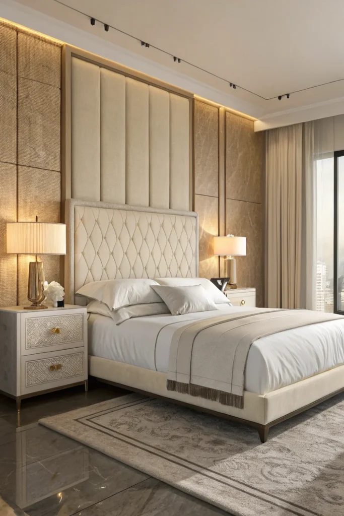 Choose a cream upholstered headboard in boucle fabric for the highest texture impact alongside dusty pink accents — boucle’s loopy, tactile surface photographs beautifully against dusty pink bedding and throws, and the cream-boucle combination has become one of the most reliably aspirational bedroom material pairings across contemporary interior design.