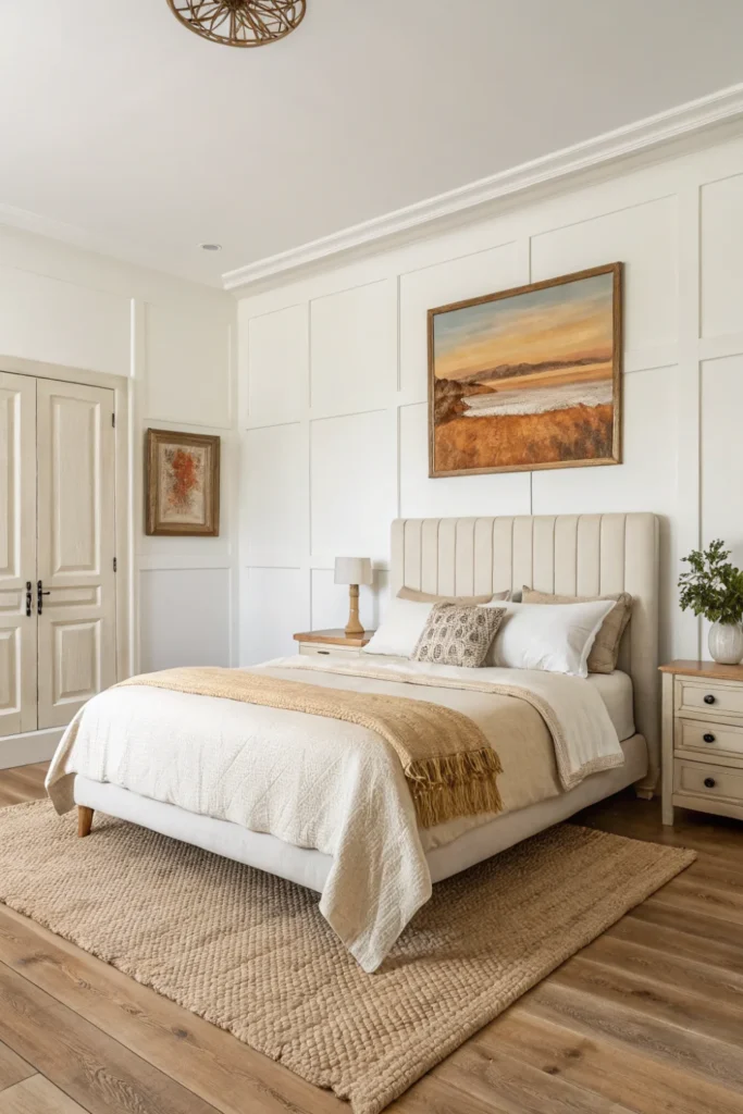 This cream bed frame room idea works equally well in traditional, Scandinavian, and contemporary settings, adapting its character depending on the surrounding materials — natural oak, warm linen, and wicker make it feel organic and Scandi; velvet cushions, brass hardware, and printed wallpaper make it feel richly traditional; clean lines and minimal accessories make it feel modern and restrained.