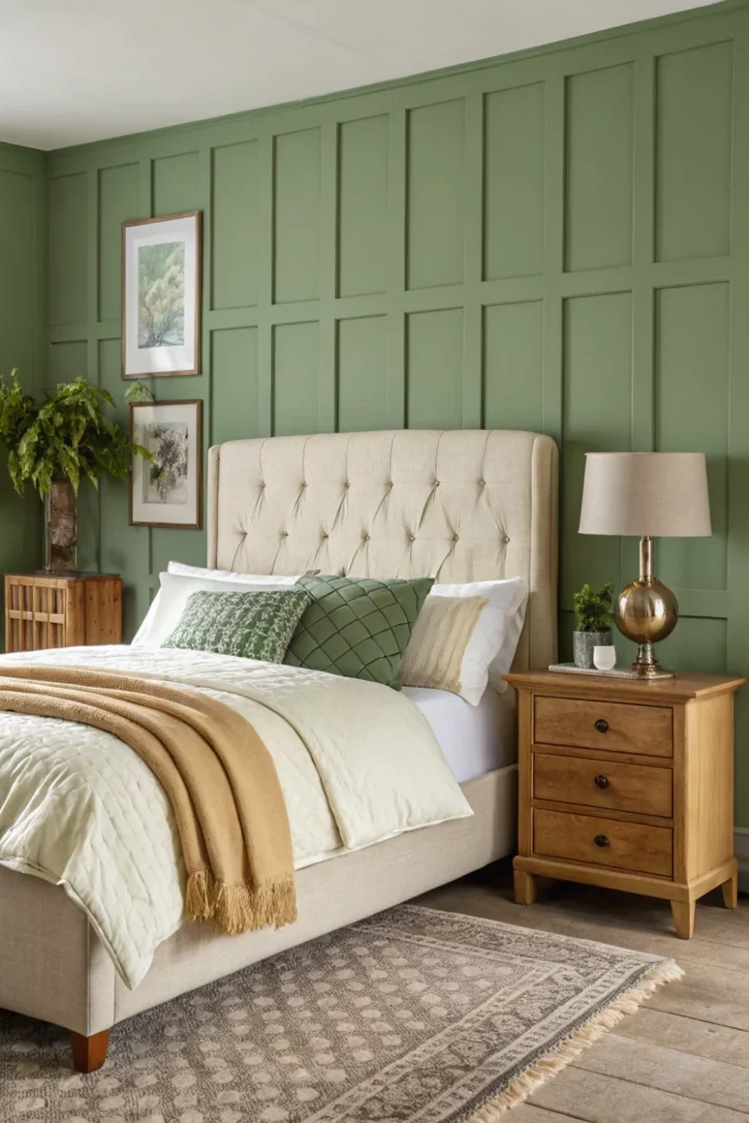 Choose a sage green with warm rather than cool undertones to complement a cream bed frame — a sage that leans slightly yellow-green will harmonise with the warmth of cream, while a sage that leans blue-green can create a slight chromatic tension with cream’s yellow undertones that makes the room feel slightly unresolved.