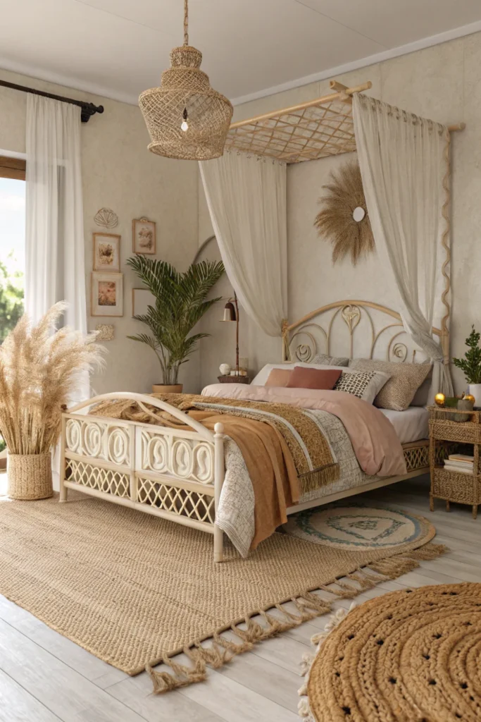In a boho-inspired bedroom, a cream rattan bed frame anchors a layered arrangement of mixed textiles, earthy tones, and botanical accessories — trailing plants, woven cushions, a Moroccan rug, and pampas grass in a ceramic vase all sit naturally alongside the cream rattan’s organic texture and warm neutral colour.
