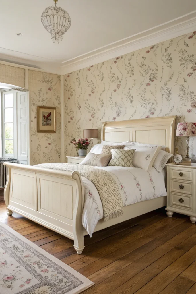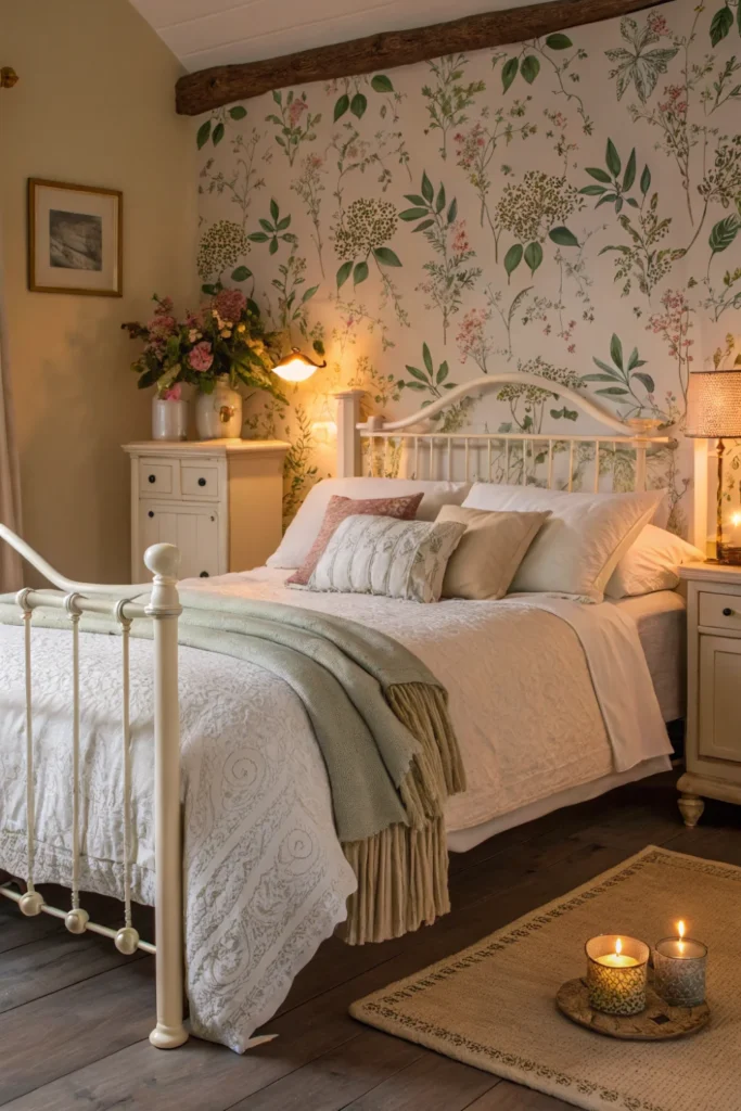 Cream painted iron or metal frames bring a lightness and delicacy to the bedroom that upholstered frames cannot — the visual openness of the frame allows the wall treatment and bedding to be seen through and around the headboard, creating a layered, airy quality that heavier frame styles preclude. Vintage floral wallpaper, lace-edged bedding, and layered antique quilts are the natural companions.