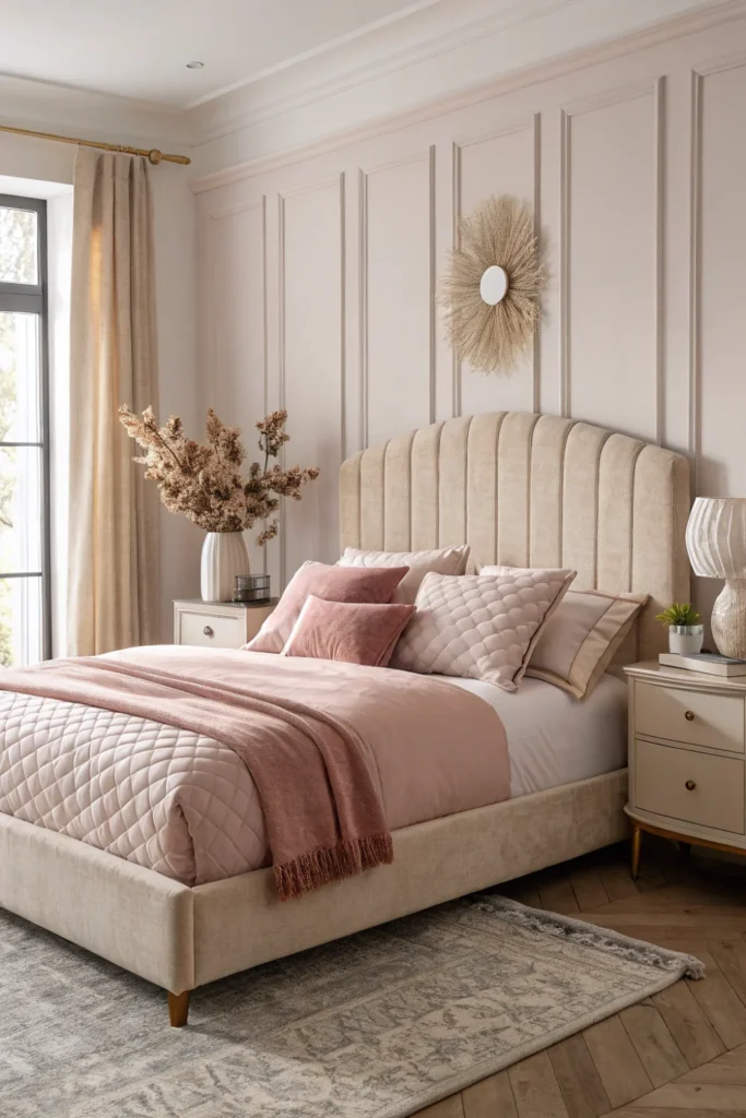 The cream upholstered headboard serves as the calm, neutral foundation while the dusty pink accents provide the emotional warmth and colour story — a combination that suits primary bedrooms, guest rooms, and teen bedrooms equally well and produces results that consistently appear in the most aspirational bedroom styling content across all design platforms.