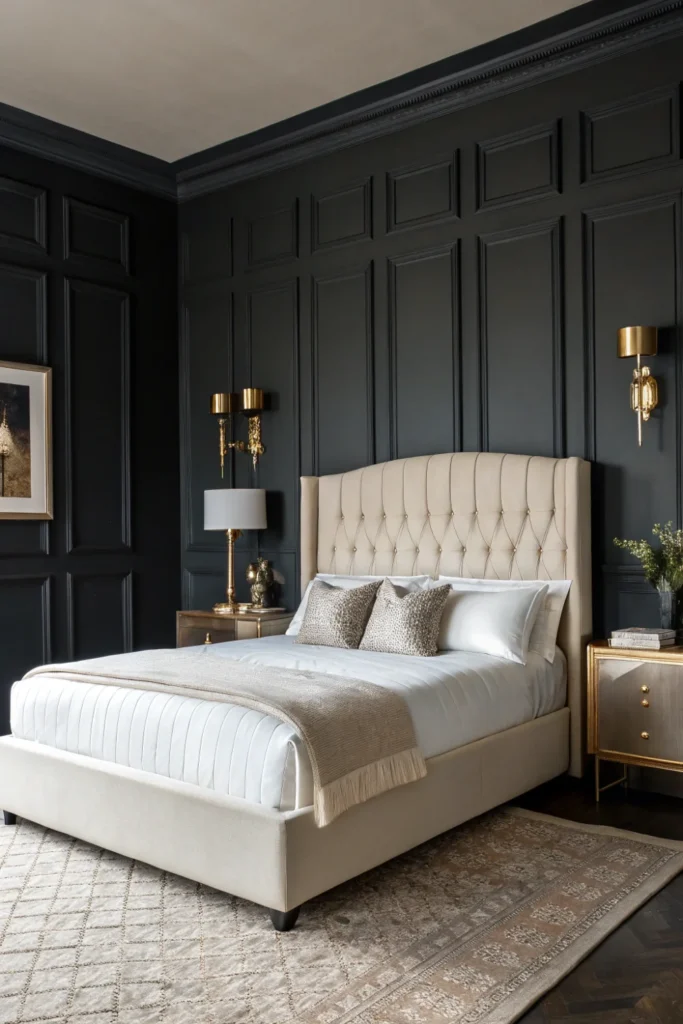 This combination reverses the conventional assumption about cream — rather than sitting quietly in a light room, the cream frame becomes bold and prominent against a dark backdrop, taking on a graphic strength and visual presence that it lacks when surrounded by similarly light tones. The result is a bedroom with genuine design courage and striking visual impact.