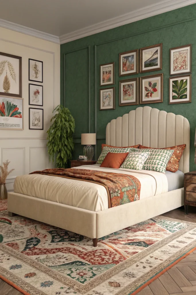 In a maximalist, richly layered bedroom, a cream bed frame performs the crucial function of visual anchor and resting point — providing a calm, neutral centrepiece around which layers of pattern, colour, and texture can be confidently piled without the room tipping from richly abundant into visually exhausting.