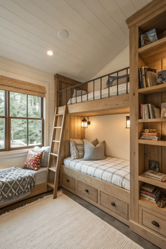 Pro Tip: Use semi-gloss paint on shiplap in bunk rooms rather than flat—the slight sheen allows easier cleaning of handprints and scuffs inevitable in children’s spaces while maintaining crisp appearance.