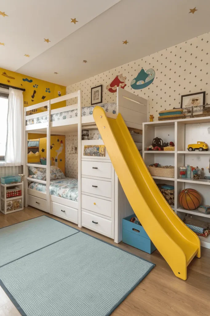 Playful bunk bed rooms incorporate slides from top bunks that transform sleeping areas into exciting play zones kids eagerly anticipate. The slide adds fun factor while encouraging active play and imaginative adventures right in the bedroom.