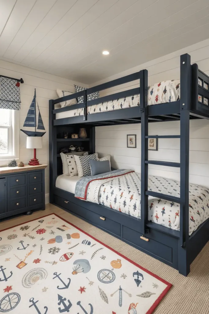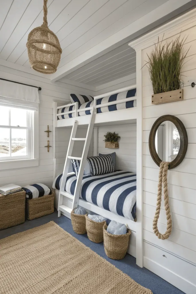 Built-in or freestanding white bunks disappear against shiplap backgrounds, creating cohesive envelopes. Striped bedding, anchor motifs, and weathered wood accents complete the maritime theme without feeling juvenile.