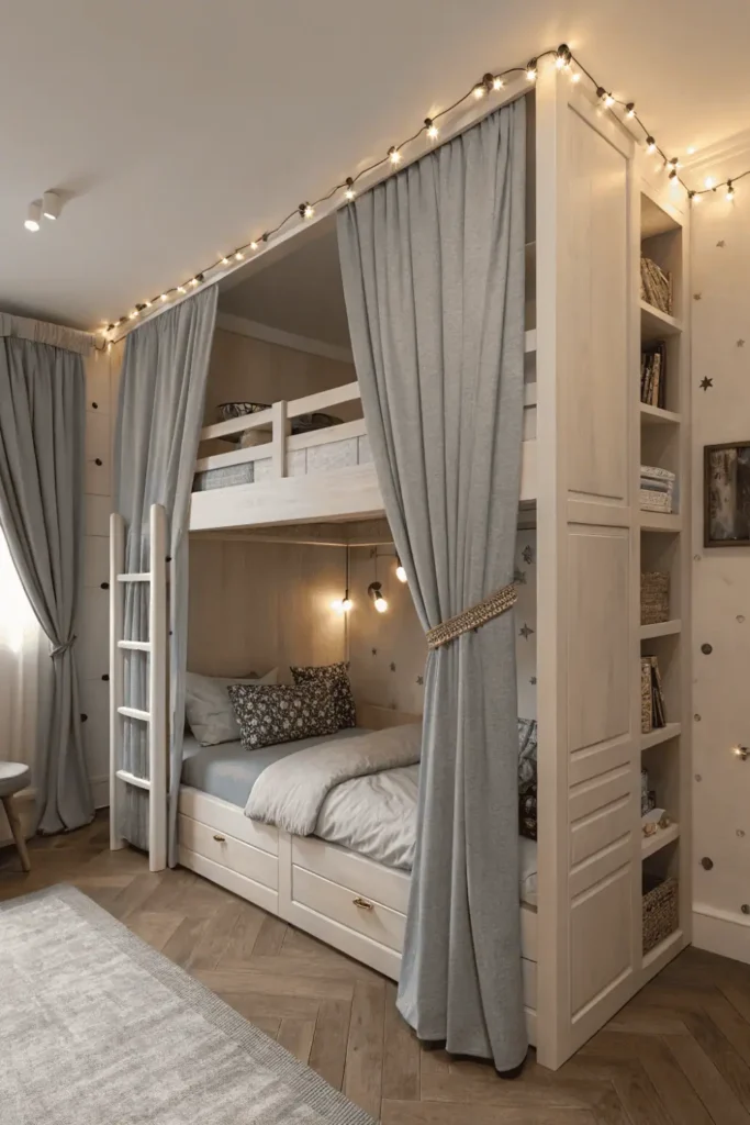 Bunk bed rooms with privacy curtains give each child personal space and visual separation through fabric panels that slide along mounted rods. Curtains create cozy sleeping nooks while reducing light and noise transfer between bunks.