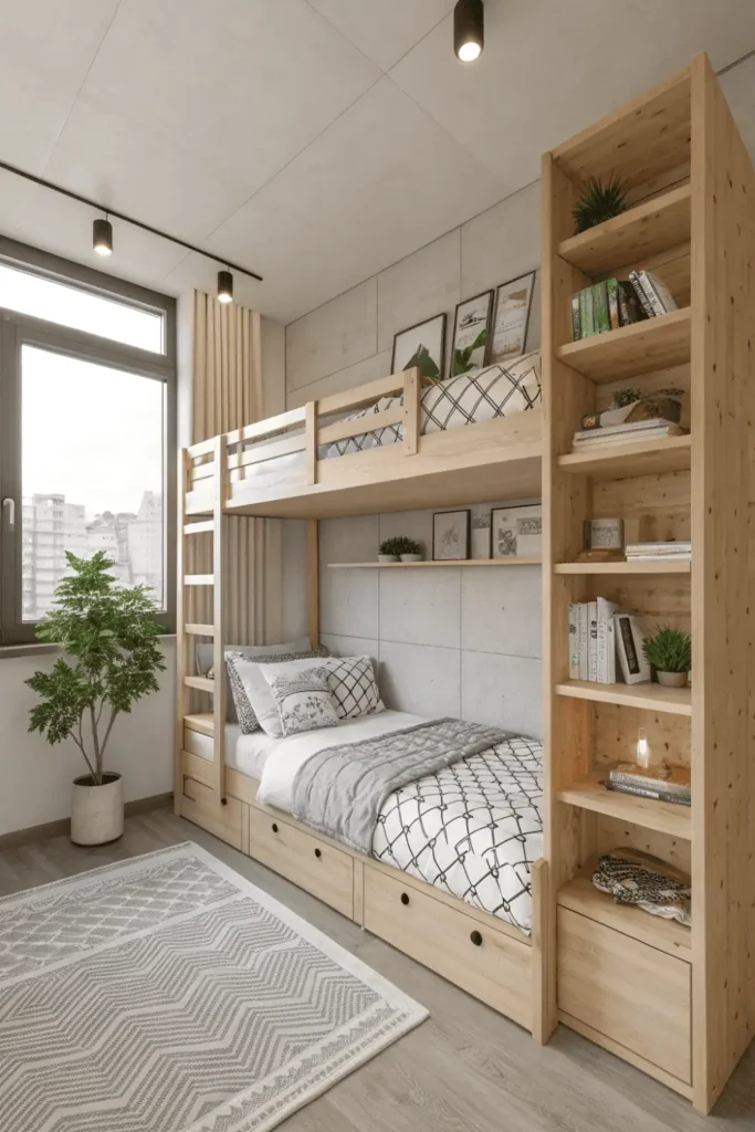 Strategic storage in bunk bed rooms reduces visual clutter that makes spaces feel cramped—built-in drawers, under-bed storage, and vertical shelving contain belongings neatly. Limit decorative items to carefully curated pieces rather than overwhelming surfaces with excessive accessories that create chaotic, crowded feelings in already-compact rooms.