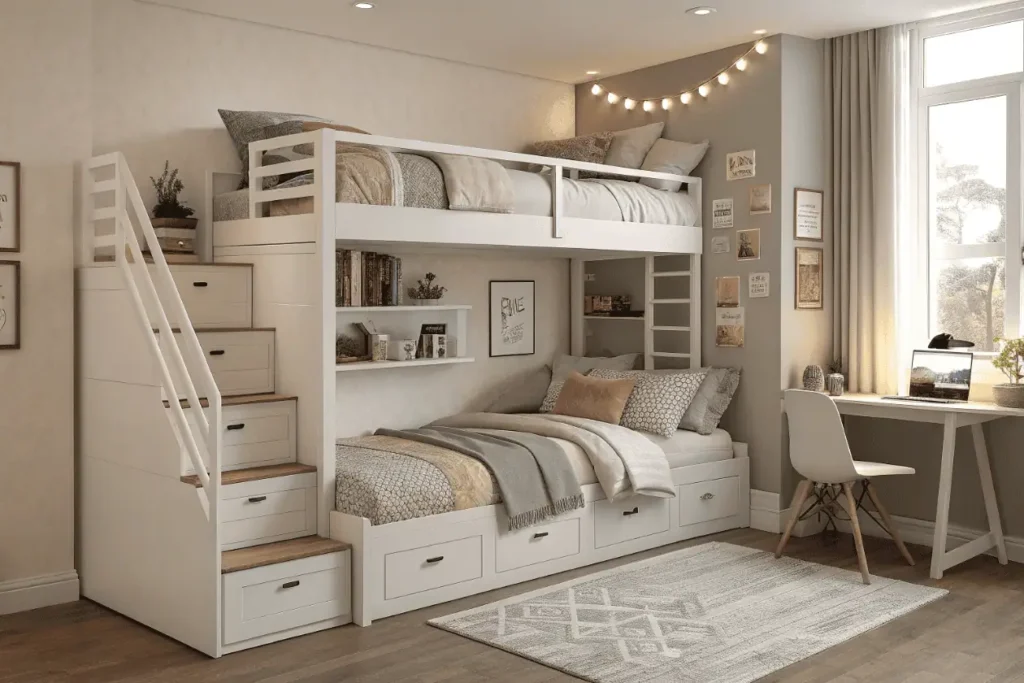 Quality bunk bed rooms adapt to changing family needs over 10-15+ years through convertible designs that separate into individual beds when sharing ends. This longevity protects furniture investment by serving multiple configurations rather than requiring complete replacement as children’s needs evolve from shared rooms to privacy.