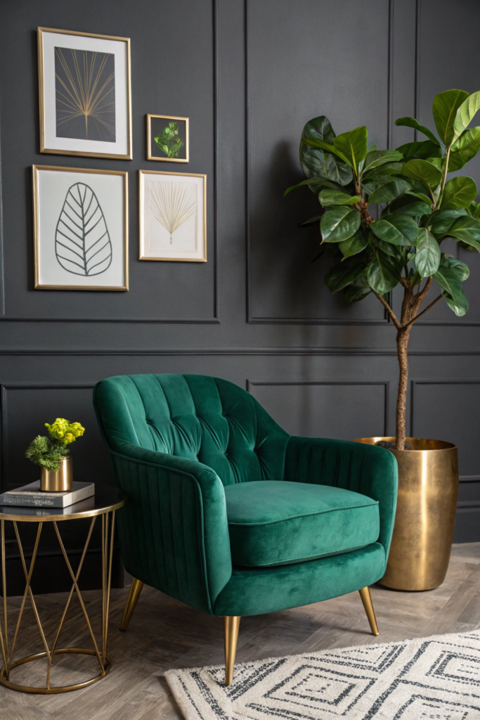 Green velvet pillows, artwork, or upholstery create harmony with any plants in your space while maintaining the moody aesthetic. This color choice bridges the gap between organic and elegant design approaches.