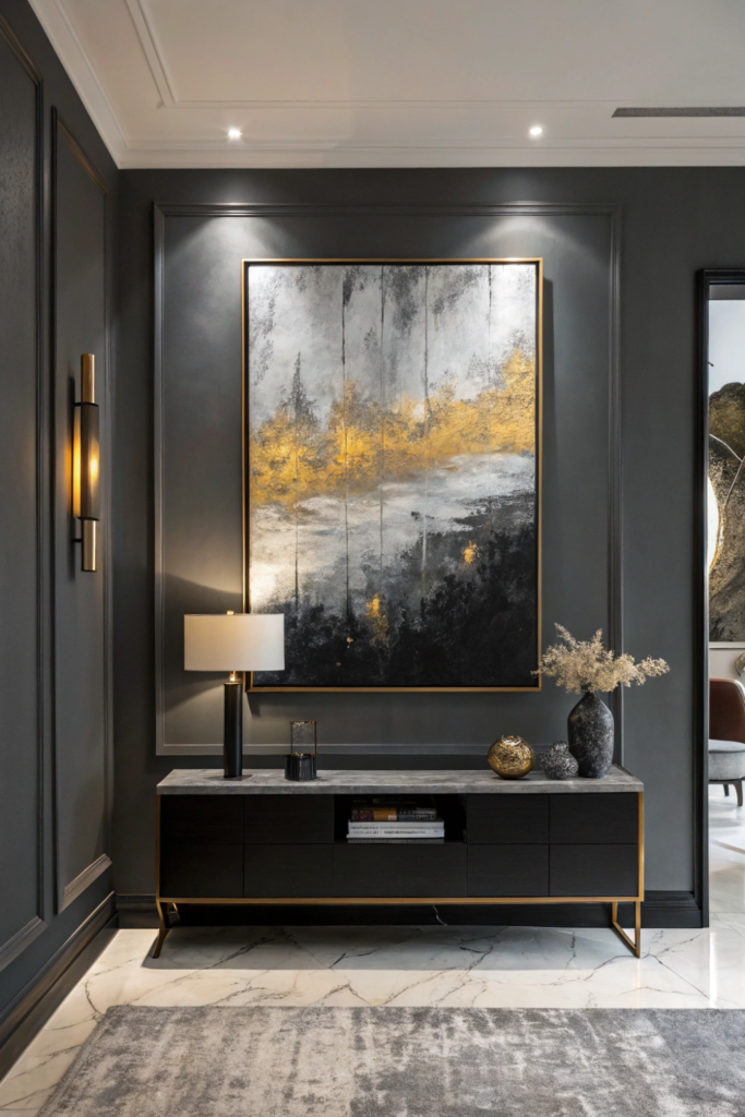 Pro Tip: Use picture lights or track lighting to illuminate dark artwork, creating depth and ensuring the piece remains visible rather than disappearing into similarly toned walls.