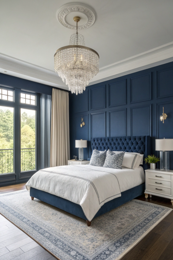 Navy walls in bedrooms create a cocoon-like atmosphere that naturally promotes relaxation and restful sleep. This shade reads as sophisticated rather than heavy, especially when paired with crisp white bedding.