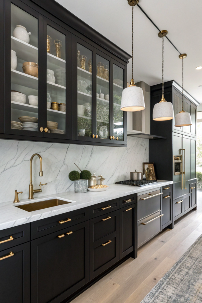 Pro Tip: Install under-cabinet LED lighting to illuminate countertops and prevent your black cabinets from making the workspace feel dim during food preparation.