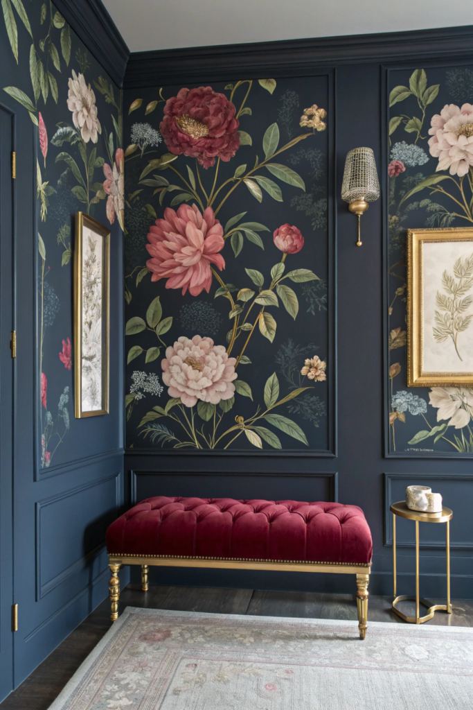 Pro Tip: Use dark floral wallpaper on a single accent wall and paint remaining walls in the wallpaper’s background color to create cohesion without overwhelming the space.