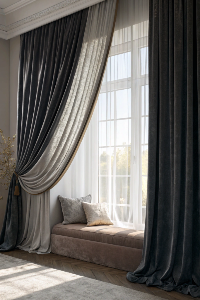 Heavy velvet or linen blackout curtains in deep tones serve both functional and aesthetic purposes in dark home decor. They provide excellent light control while framing windows with substantial visual weight.