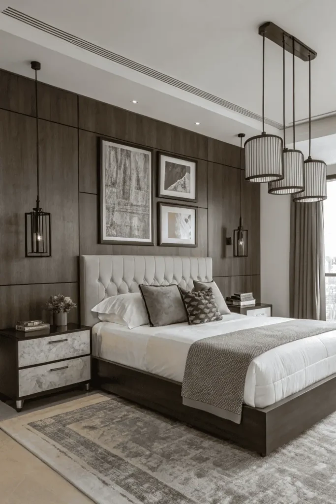 Transform your bedroom into a 1920s-inspired Art Deco sanctuary by pairing dark wood with geometric patterns and metallic accents. The rich wood provides the perfect backdrop for bold, glamorous styling.