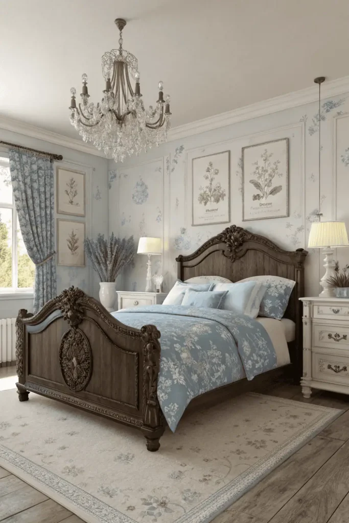 Incorporate toile de Jouy fabrics, distressed white furniture pieces, crystal chandeliers, and lavender accents for authentic French flair. Antique mirrors and vintage botanical prints complete the romantic aesthetic.