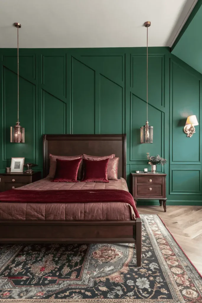 Embrace the drama by surrounding your dark wood bed frame with deep emerald walls or navy blue accents. This bold approach creates a cocoon-like atmosphere that’s perfect for restful sleep and romantic evenings.