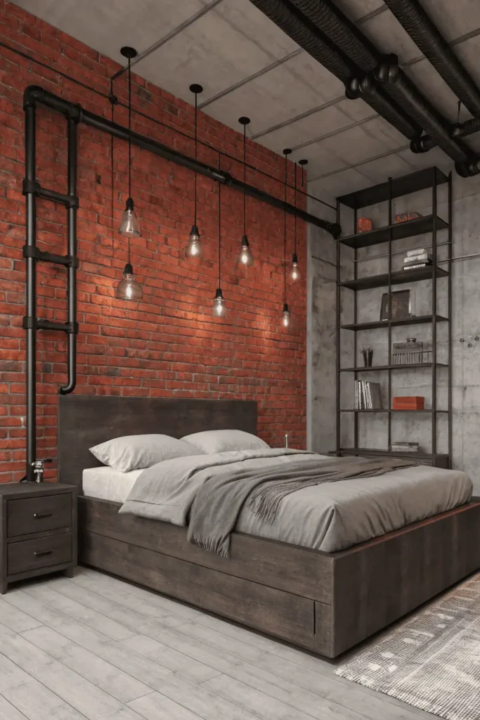 Incorporate Edison bulb lighting, concrete planters, and black metal shelving to enhance the industrial feel. Keep bedding simple with gray linen or white cotton to balance the harder textures in the room.