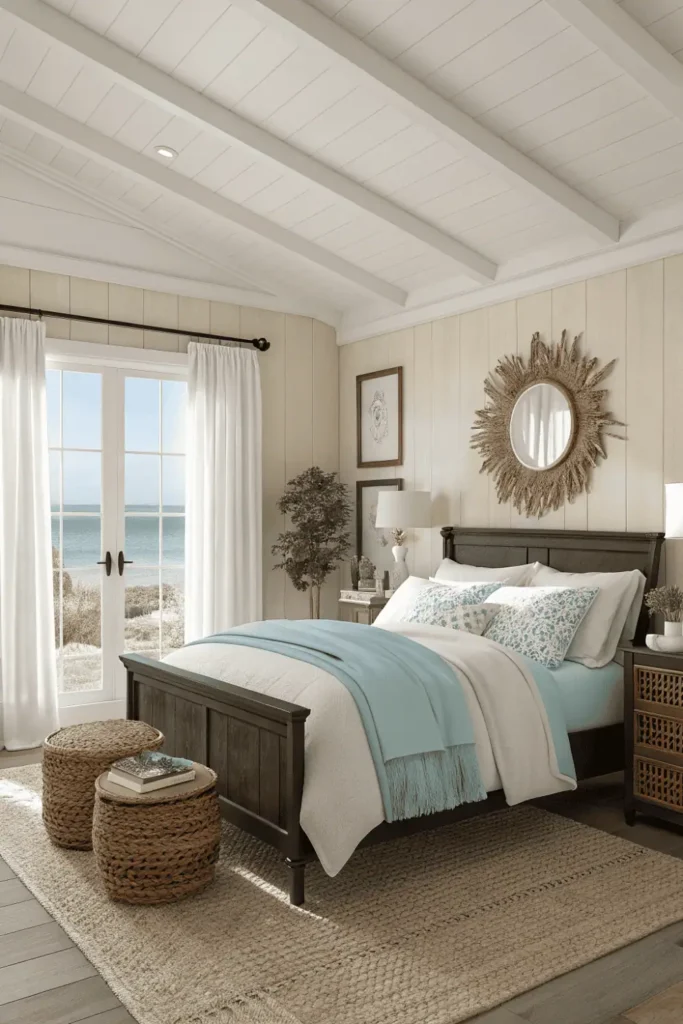Layer in linen bedding in soft blues and whites, seagrass baskets, and driftwood accents for subtle coastal references. The dark wood adds the sophistication that elevates this from kitschy to elegant.