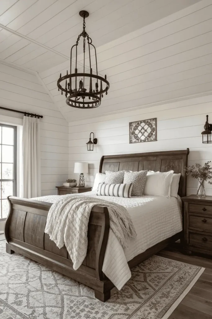Add white quilted bedding, galvanized metal accents, and reclaimed wood nightstands to complete the look. Wrought iron light fixtures and cotton throw blankets add authentic farmhouse touches.